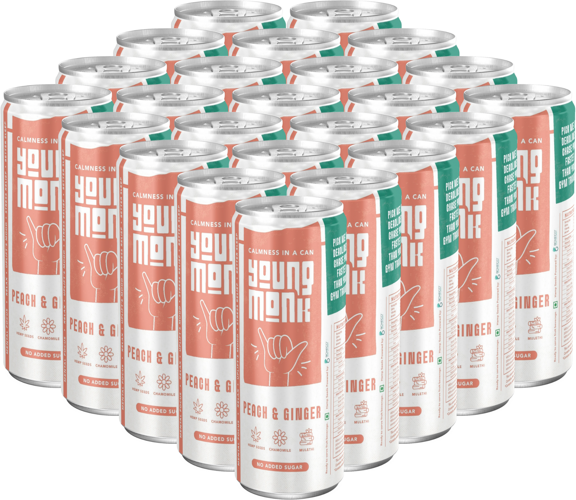 Young Monk - CALMNESS Drink - Infused with Herbs, Hemp, Zero Added Sugar - Peach & Ginger Flavour (Pack Of 24)